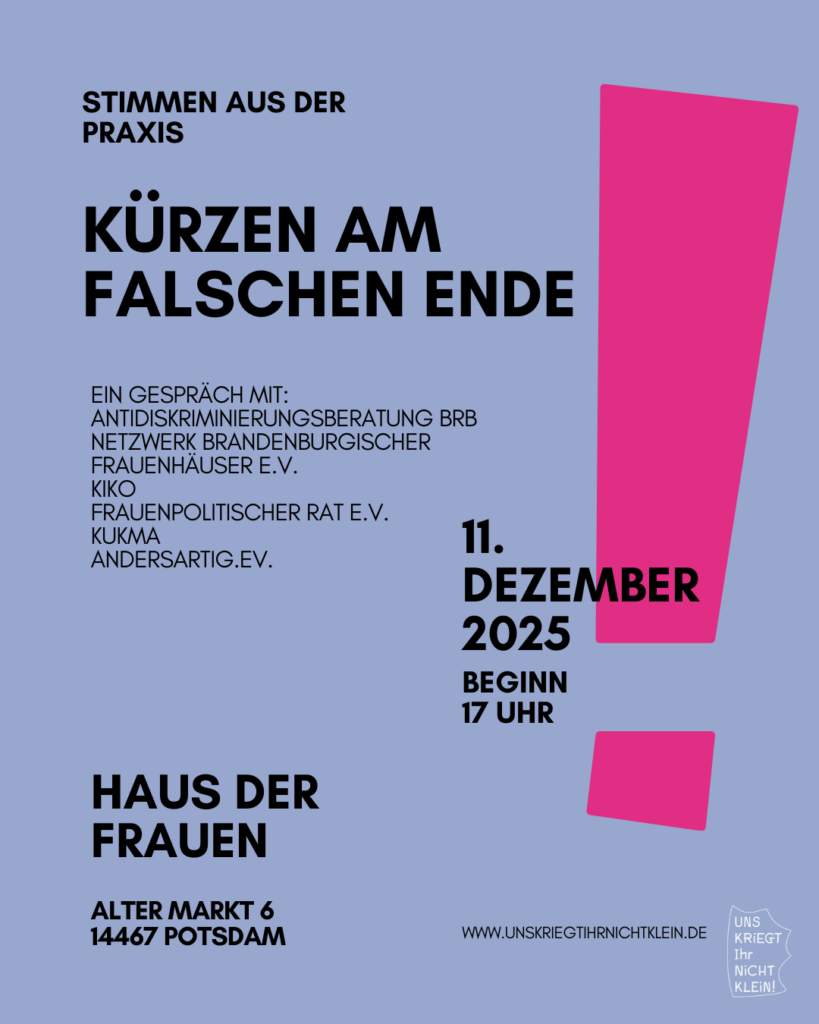 Die Pressemitteilungen über finanzielle Kürzungen von Vereinen und Organisationen , die sich in Brandenburg gegen Diskriminierung und für Gleichstellung einsetzen, häufen sich Tag für Tag und hinterlassen große Fragezeichen und Unmut. Dem wollen wir entgegenwirken und darüber mit den Akteuer*innen ins Gespräch gehen. Wir laden euch dazu ein bei dem Podiumsgespräch einen Überblick zu erhalten,…